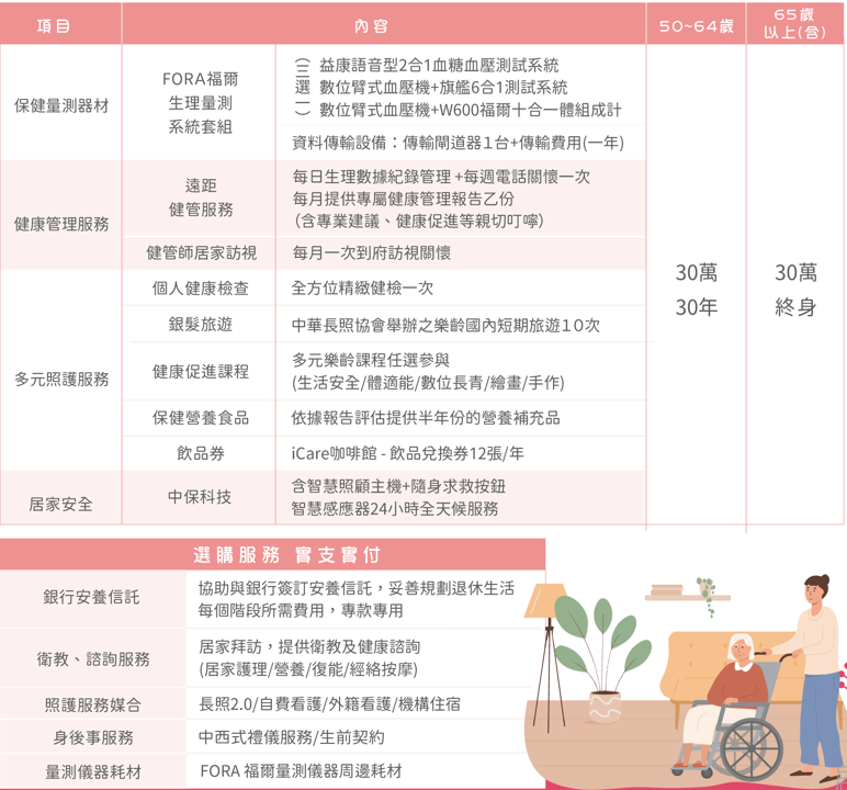 健 康 照 護 契 約:50歲~64歲10年/65歲以上終身案,整合各種長照資源,讓我們成為您的健康顧問