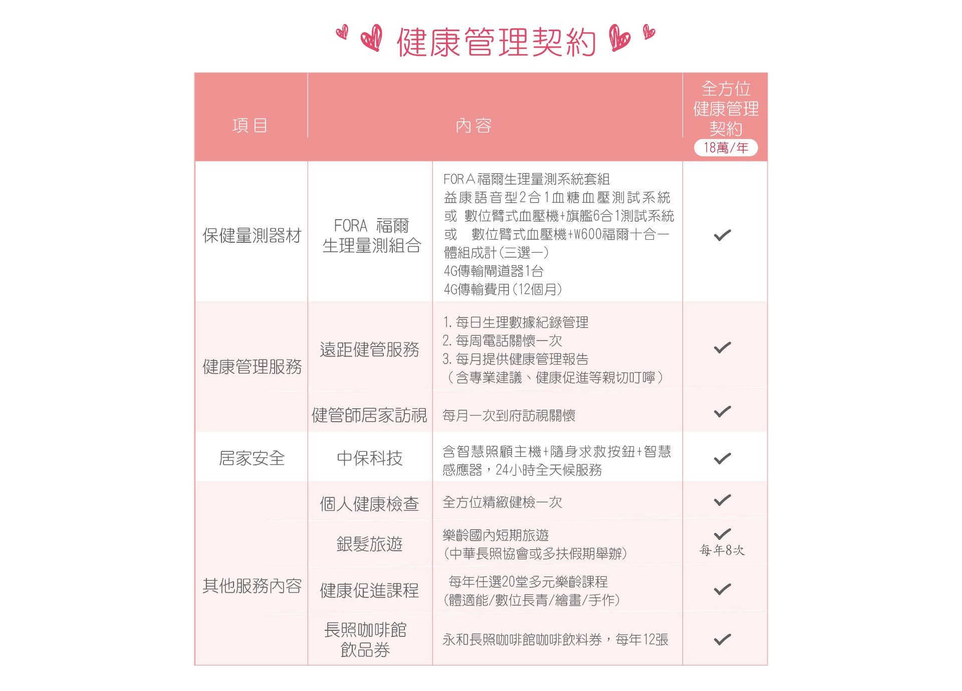 全方位健康管理契約提供生理量測儀器套組、健管師遠距健康管理、全日精緻健檢乙次,以及健康促進學習課程、樂齡旅遊及咖啡飲品券,為您的健康生活做好全方位準備!